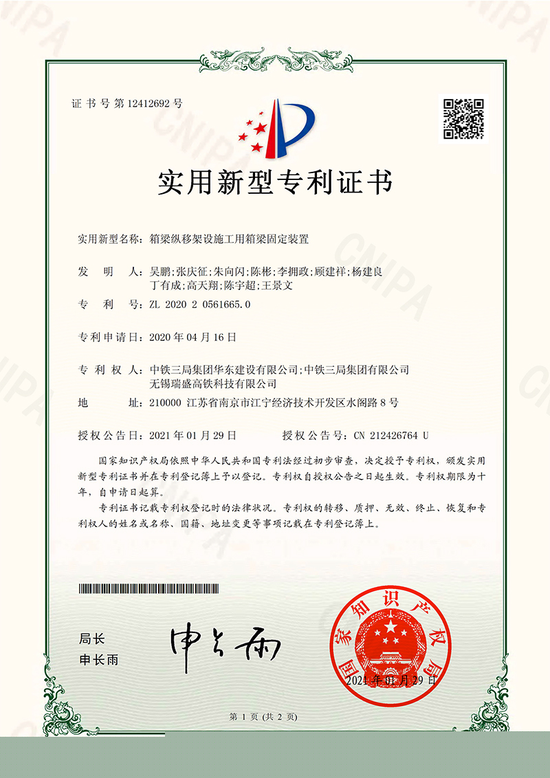 【實用新型專利證書】箱梁縱移架設施工用箱梁固定裝置